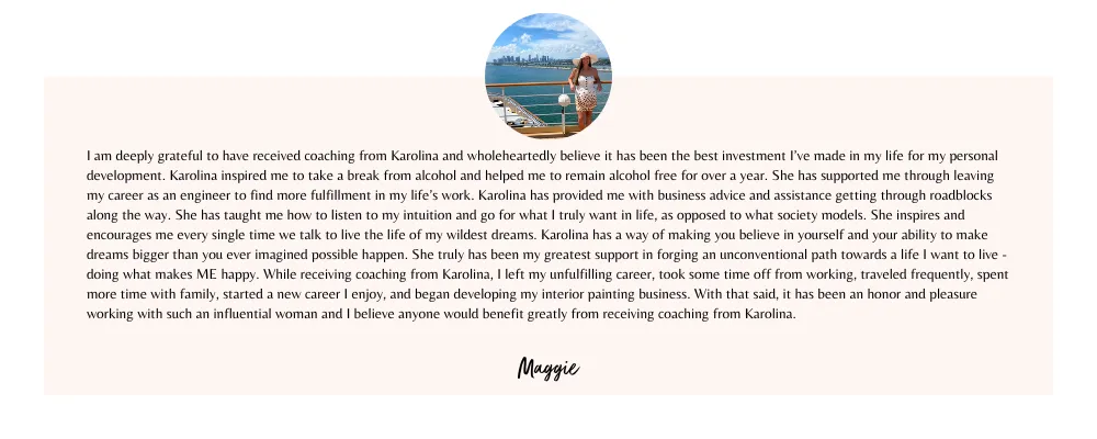 You could say, you've been working on yourself. You've been working hard to change your relationship with alcohol and feel so much more alive. You feel proud of yourself and open to new possibilities. You’re ready to unleash your deeper purpose.